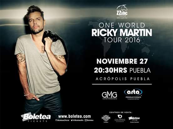 -La empresa ARTA Producciones traerá el próximo 27 de noviembre a Ricky Martin con su “ONE WORLD RICKY MARTIN TOUR 2016”en Acrópolis Puebla-